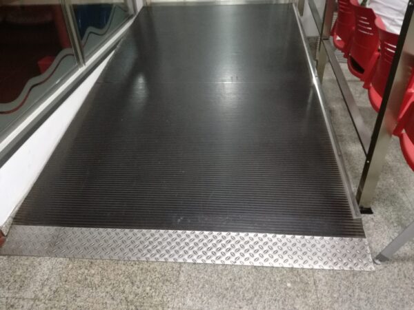 Rampa de caucho antideslizante para lugares resbaladizos. Con superficie de goma tipo rayada o abotonada.